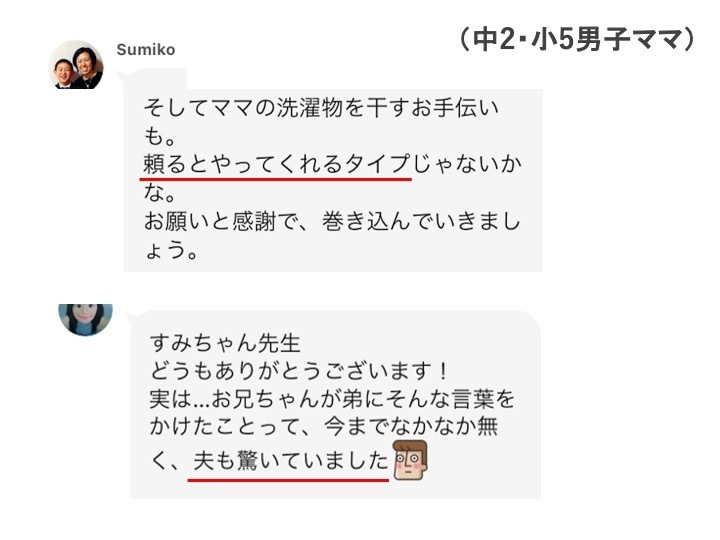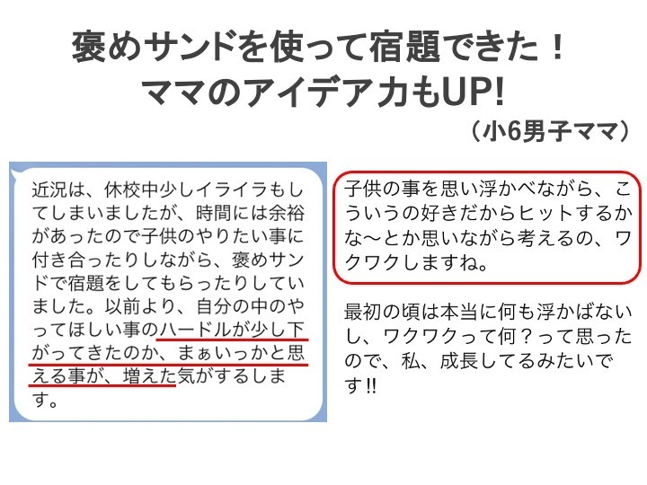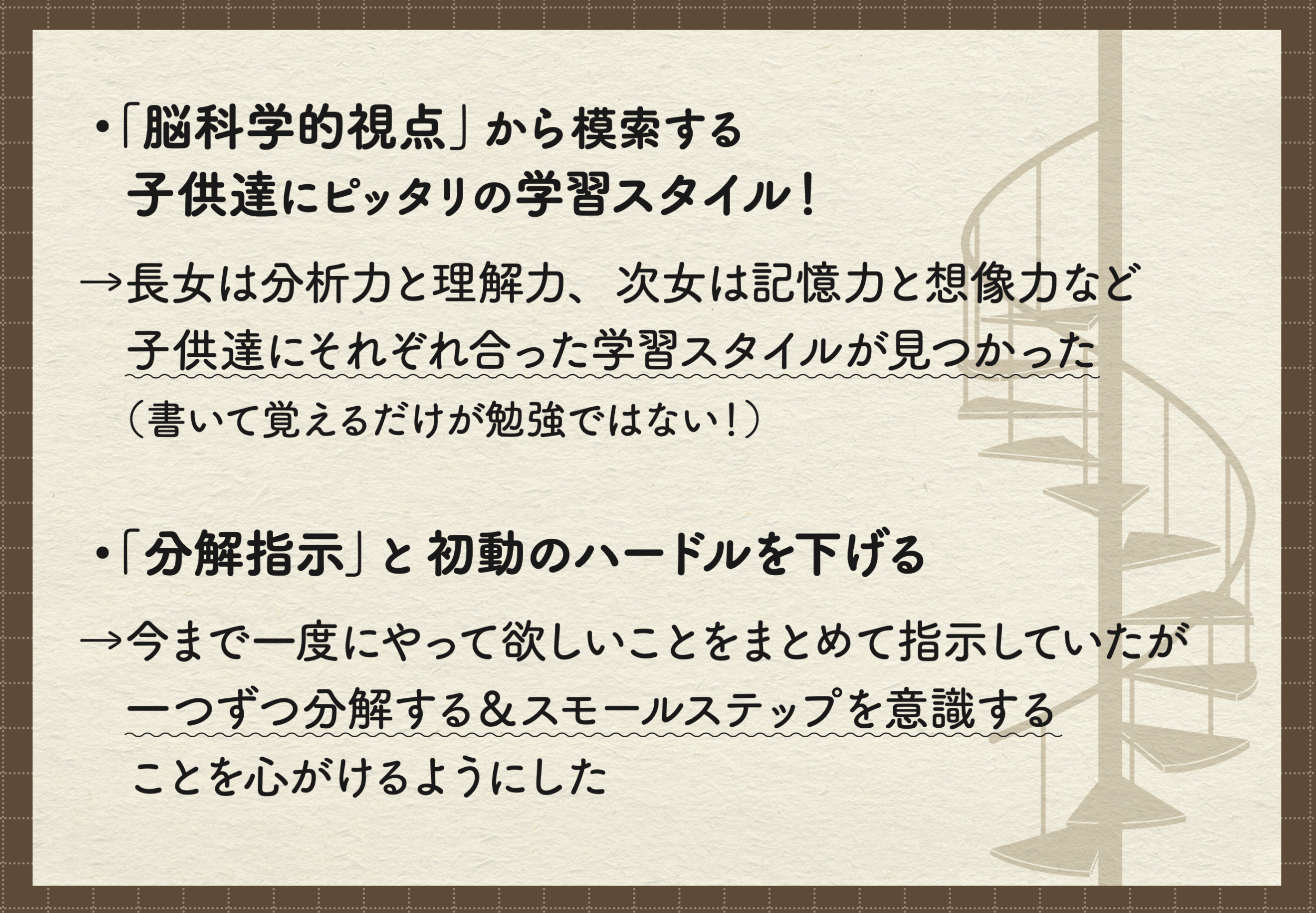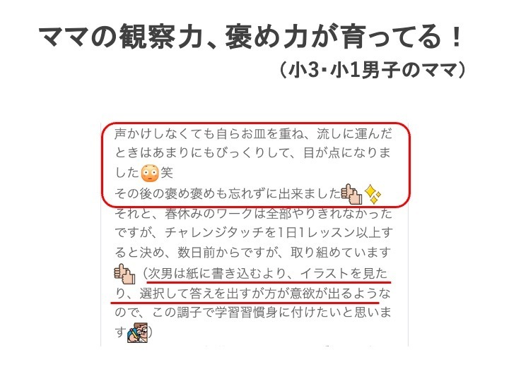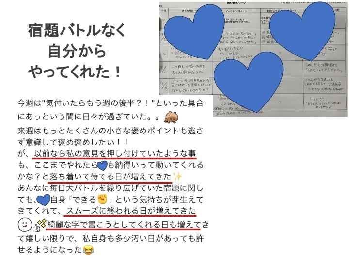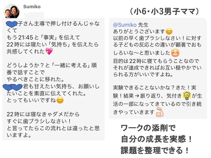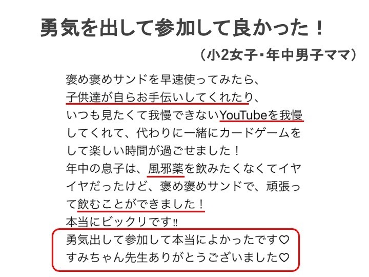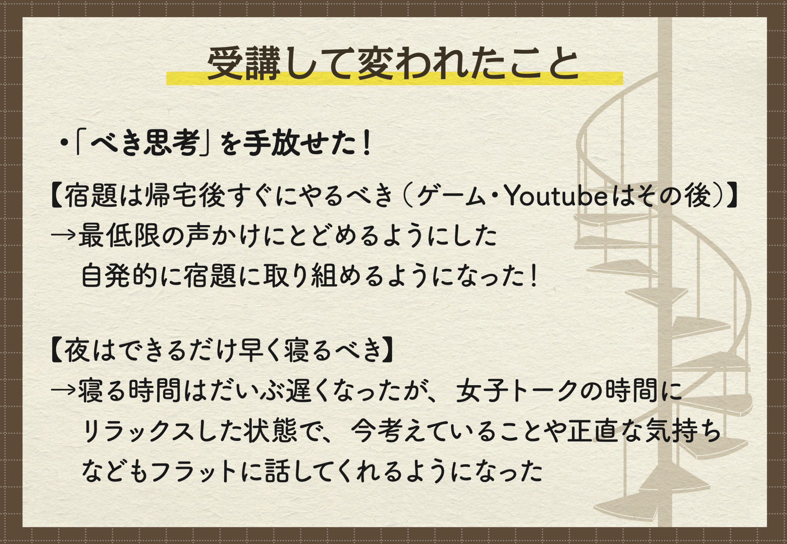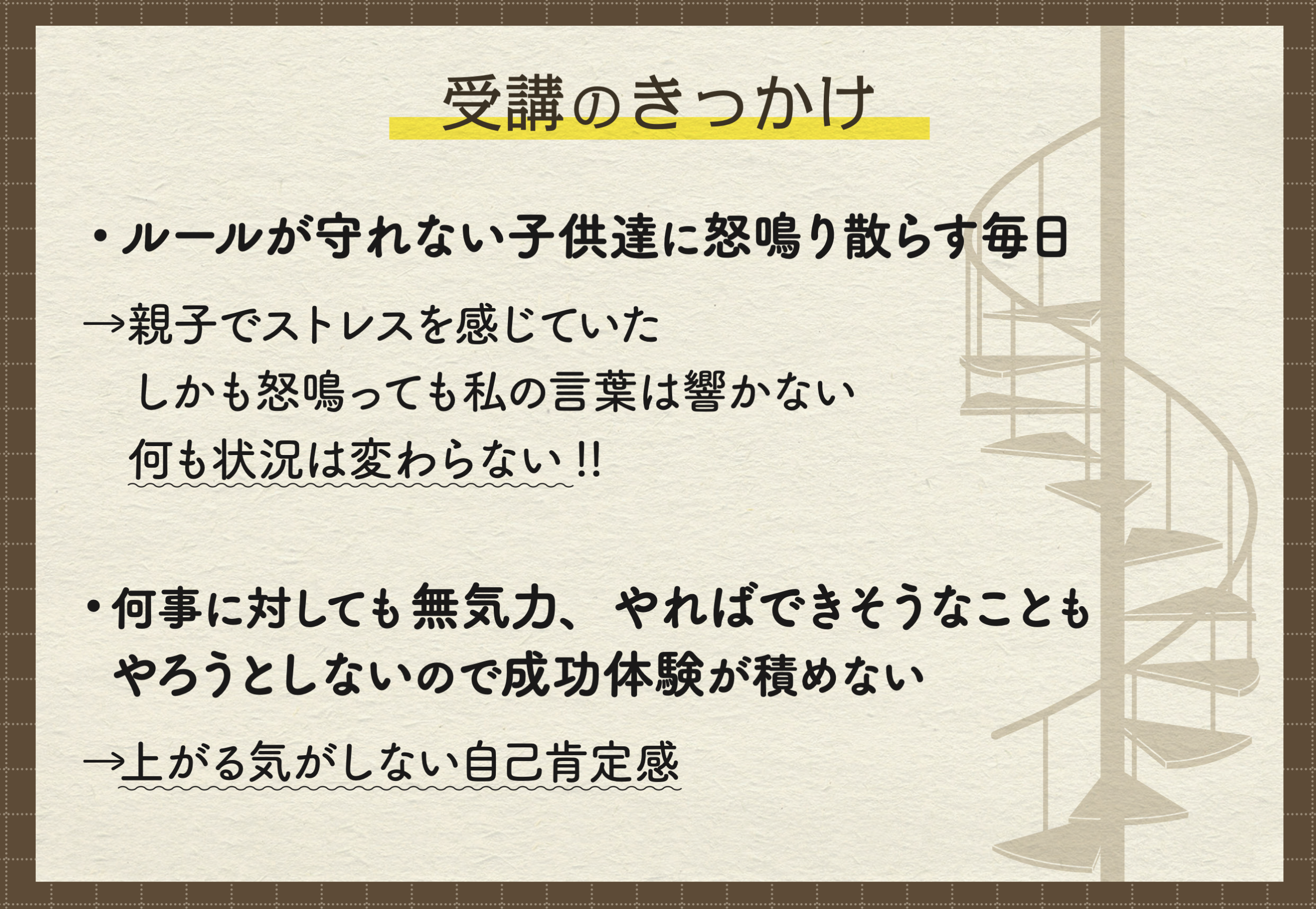 宿題や学校の準備をなかなかやらない、きょうだい喧嘩が激しい子ども達に怒ってばかりの毎日を何とかしたい!と受講を決めました。