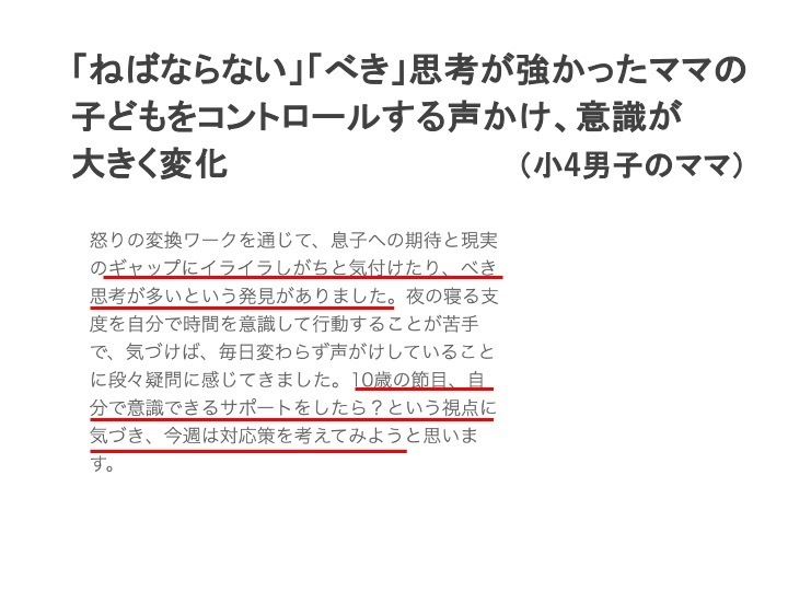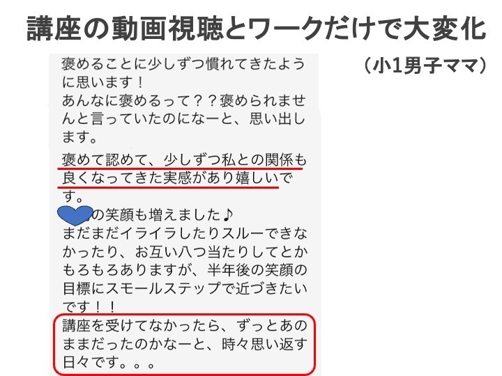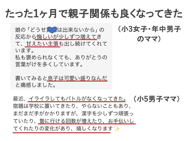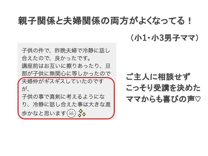 ・子どもに対して自分の理想を求めるのでなく、良いところを見つけてできることをサポートしていくことができ、親子関係が良くなった。