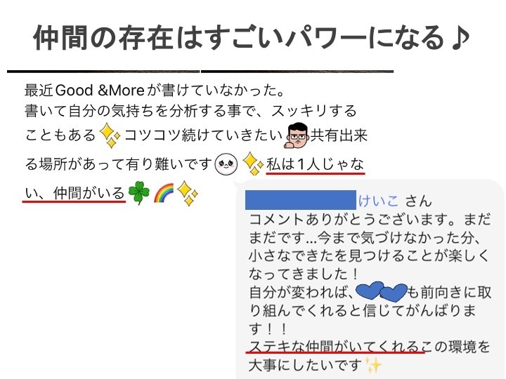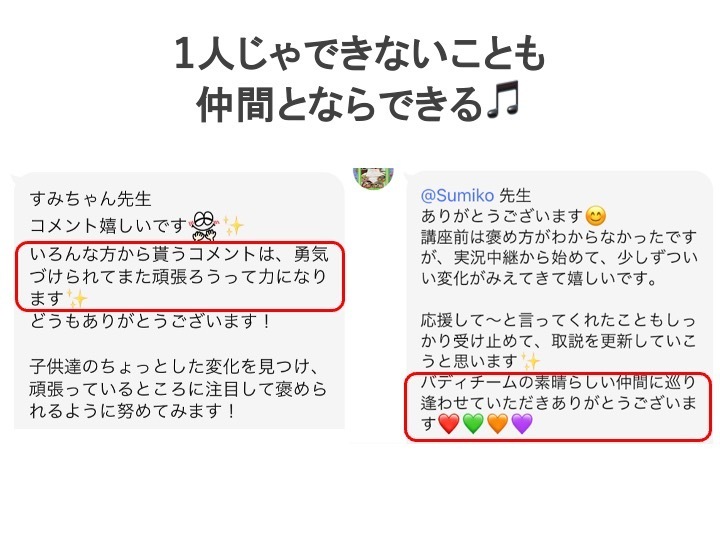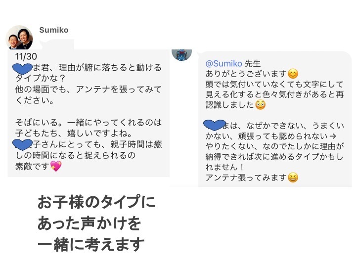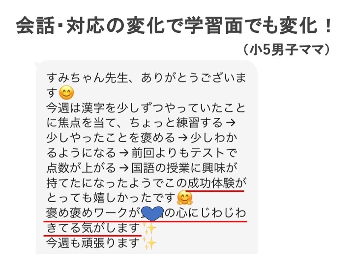 寄り添ってもらえている感じが嬉しく頑張ろうと思えました。子どもと一緒ですね^^