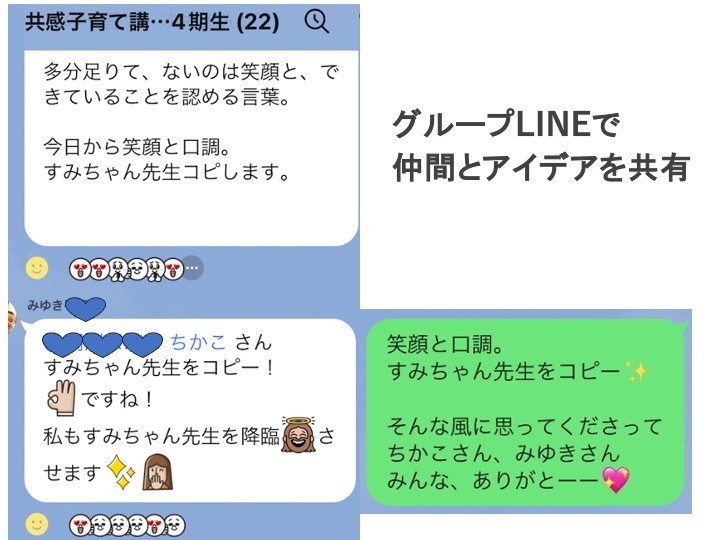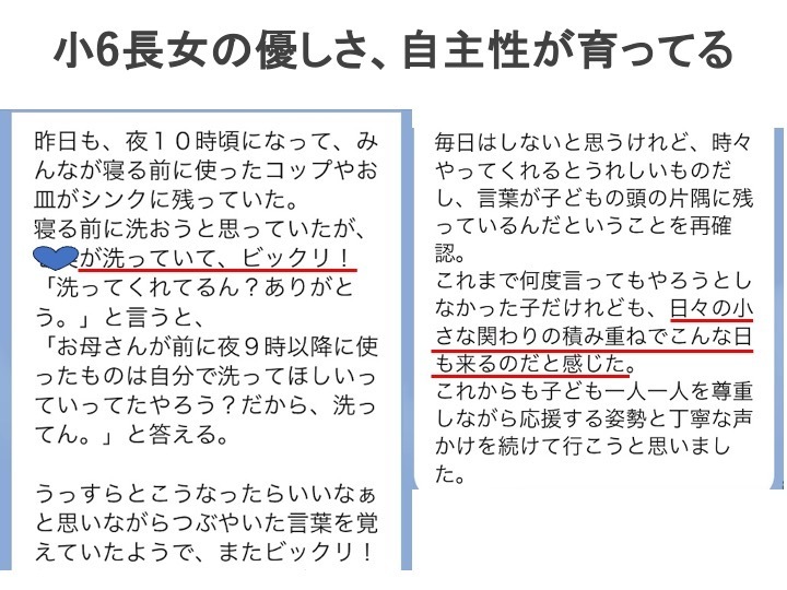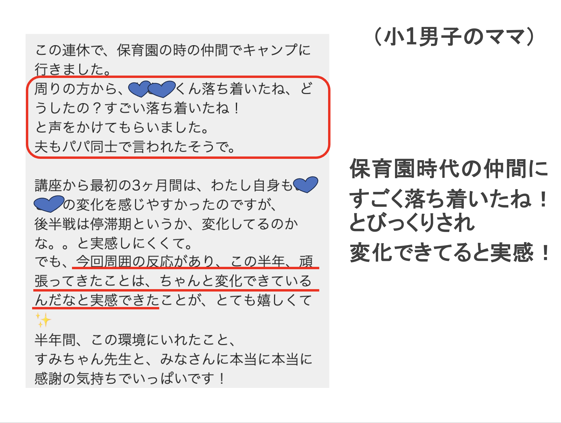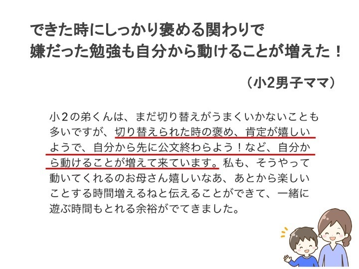 私の考え方が変わって、子どもへの声かけも学んだことを使ったり、工夫をしたら
